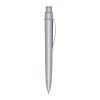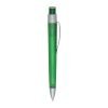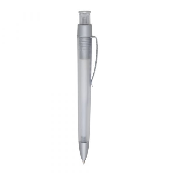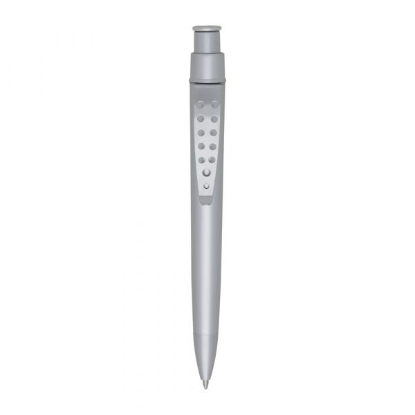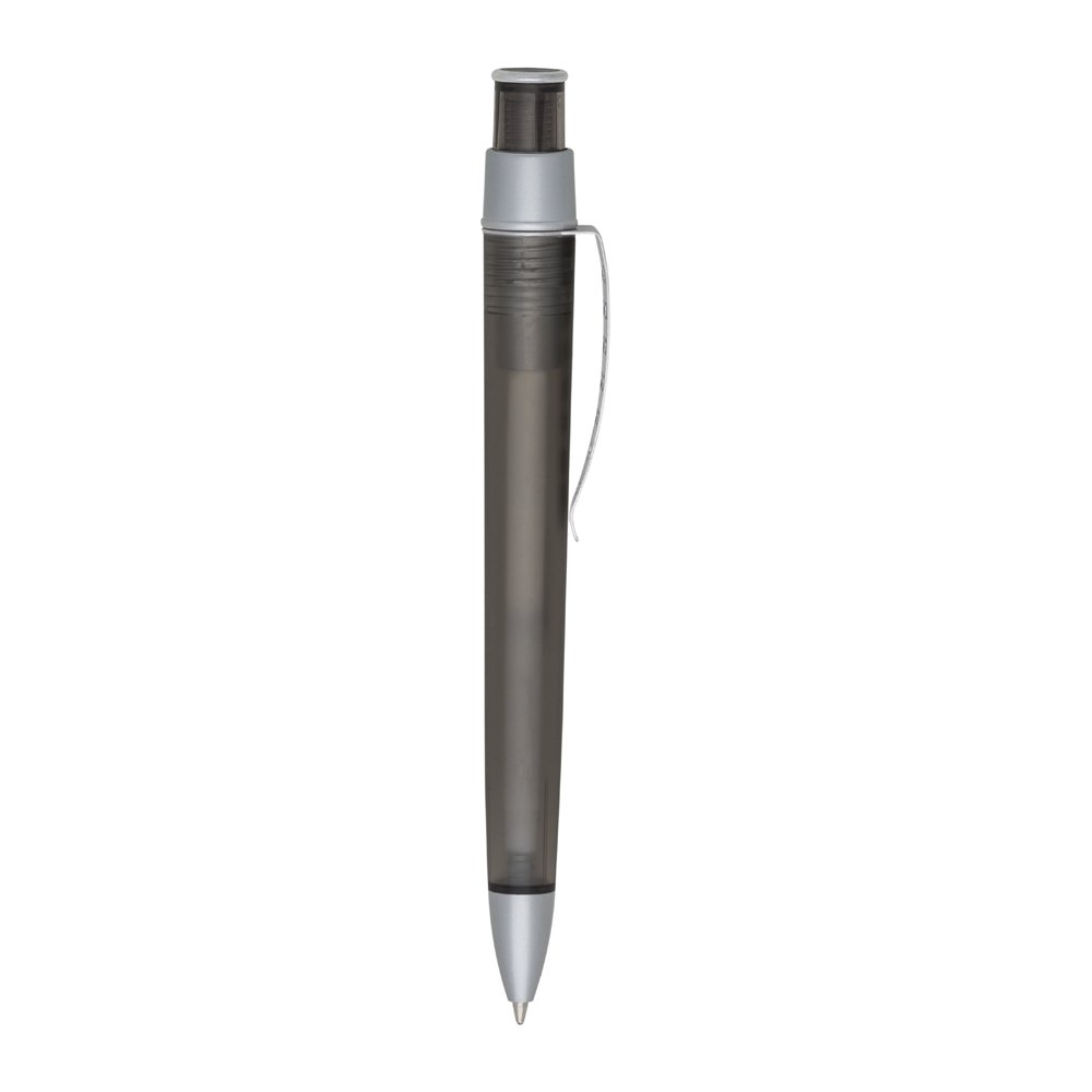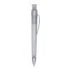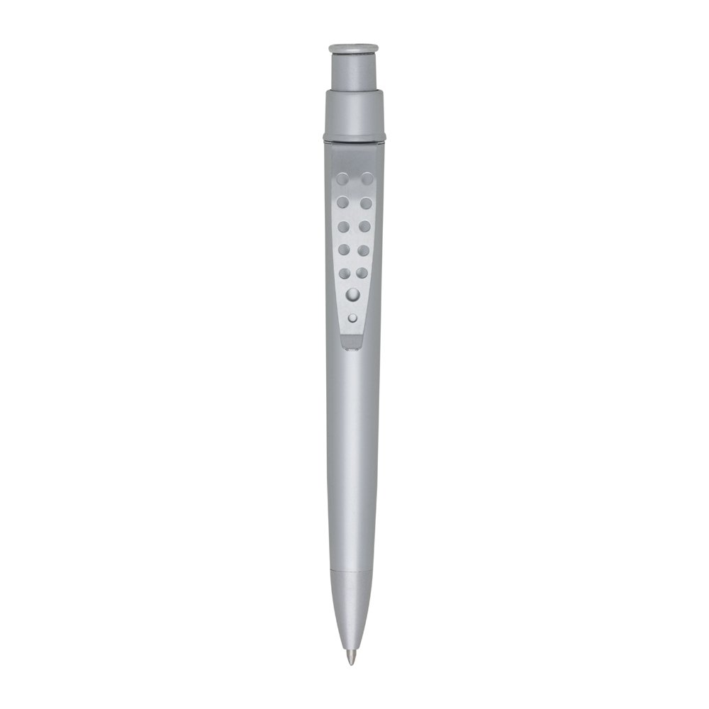 Caneta plástica com clip metálico vazado, carga esferográfica azul e acionamento por clique para uma escrita suave e prática.