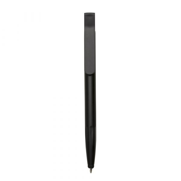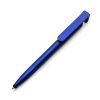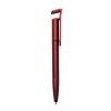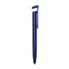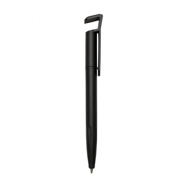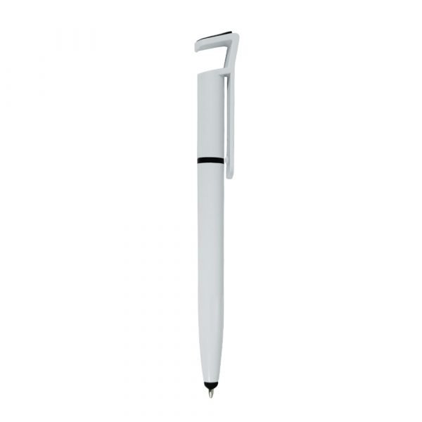 Caneta plástica com suporte para celular, ponteira touch screen e limpador de tela. Carga esferográfica azul e acionamento por rotação.