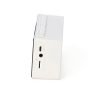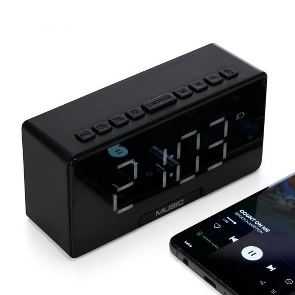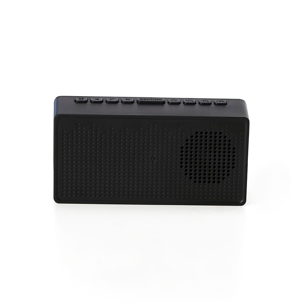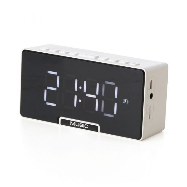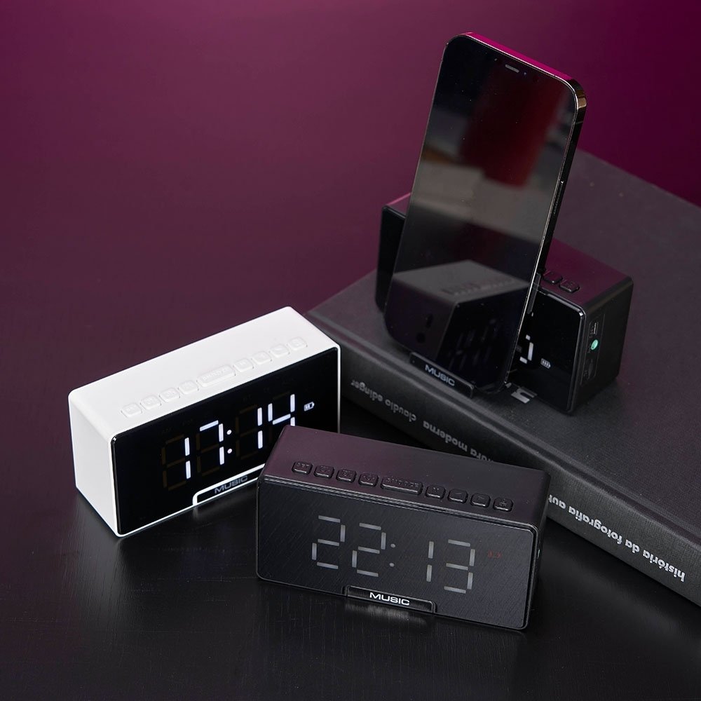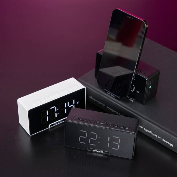 Caixa de som multimídia com relógio despertador e suporte para celular. Produzida em plástico, com borrachas antiderrapantes na área inferior, área frontal com display de LED, compartimento com suporte para celular. Executa nos modos bluetooth, cartão TF-microSD e entrada auxiliar P2. Acompanha cabo USB e manual em inglês.