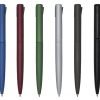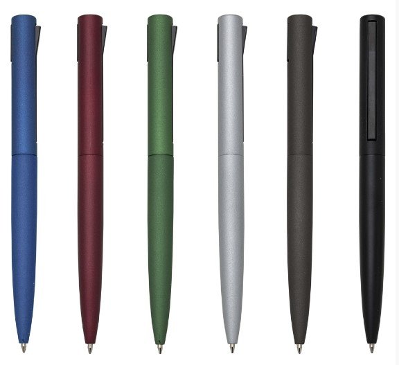 Caneta semimetal inteira colorida com pintura fosca. Possui clip metálico, para acioná-lo basta pressionar sua parte inferior e para voltar ao normal pressionar sua parte superior.