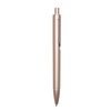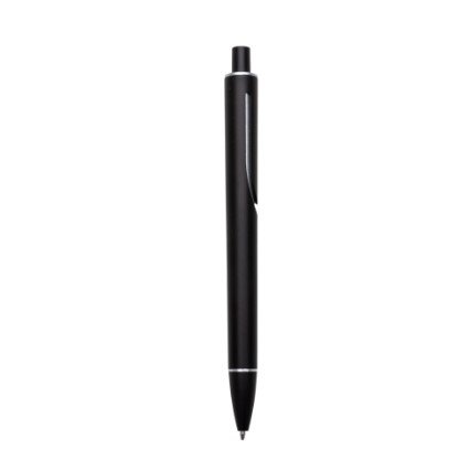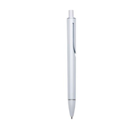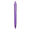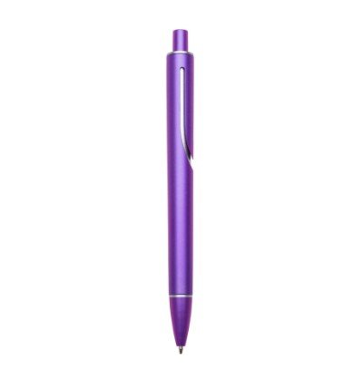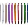 Caneta plástica inteira colorida com detalhes prata. Clip “acoplado” ao corpo da caneta, possui anel superior e inferior prata. Aciona por clique.