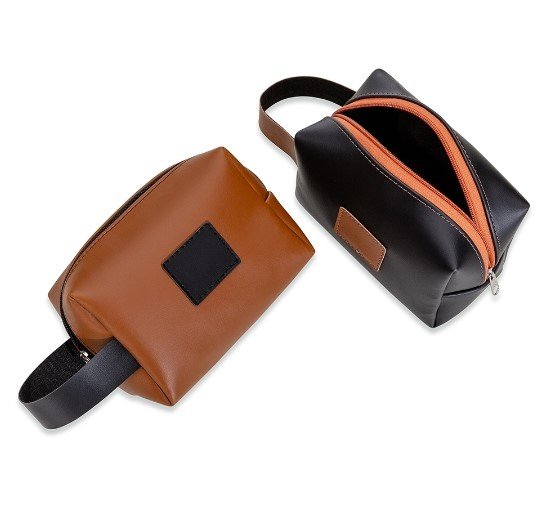Necessaire de couro sintético bidins com alça para transporte, possui plaquinha frontal para personalização e área interna da necessaire revestida de nylon. Tamanho: 14×10,5×23,5cm (com alça)