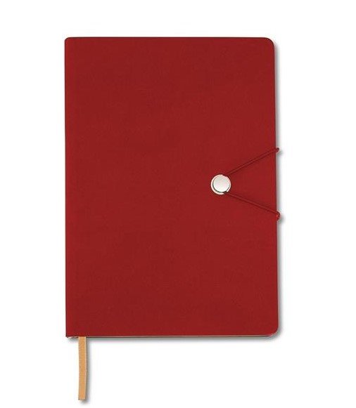 - Capa em material sintético emborrachado, possui aproximadamente 96 folhas pardas pautadas e marca página em cetim