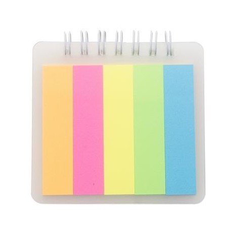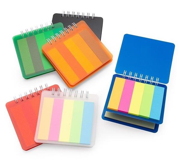 - Contém cinco blocos autoadesivos coloridos com aproximadamente 25 folhas cada e bloco amarelo com aproximadamente 25 folhas.