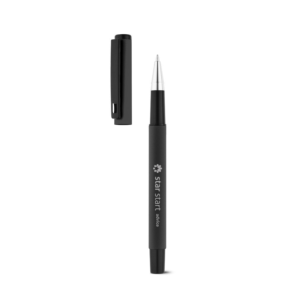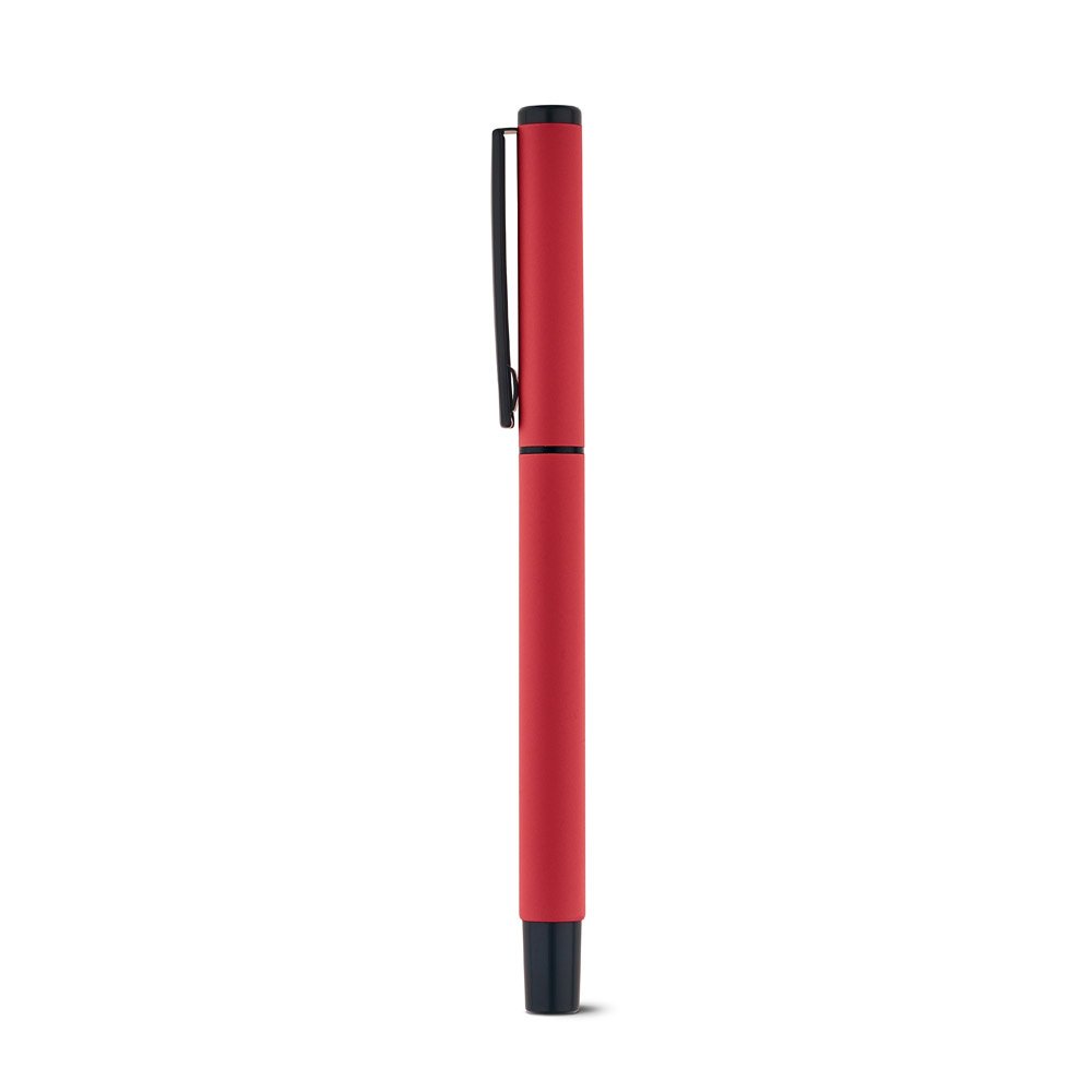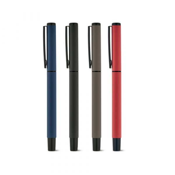 Roller em alumínio. Com clipe emborrachado, disponível em várias cores vibrantes. Oferece uma escrita suave e precisa na cor preta.