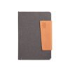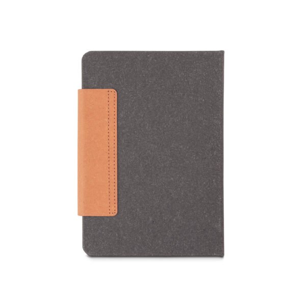 Agenda 2026 A5 em pele reciclada (58%) com fecho magnético, caneta inclusa, marcador em fita e bolsa non-woven. Elegante, prática e sustentável.