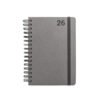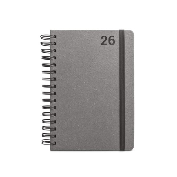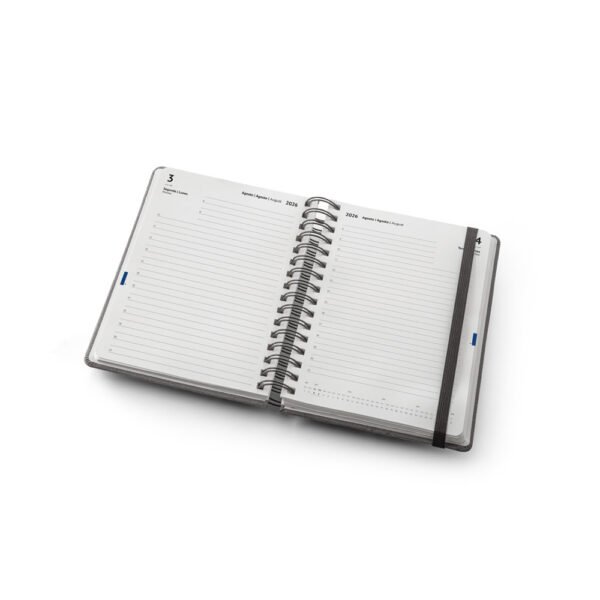 Agenda A5 em pele reciclada (58%), com argolas, elástico de fecho e plano diário. Elegante, prática e sustentável para sua rotina.