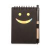 Bloco de anotações com autoadesivos e caneta. Possui detalhe “smile” na capa frontal (verso liso), caneta ecológica com acabamentos em plástico acionada por clique, primeira folha(branca) com cinco blocos autoadesivos coloridos com aproximadamente 20 folhas cada, bloco amarelo com aproximadamente 20 folhas e 70 folhas brancas pautadas.