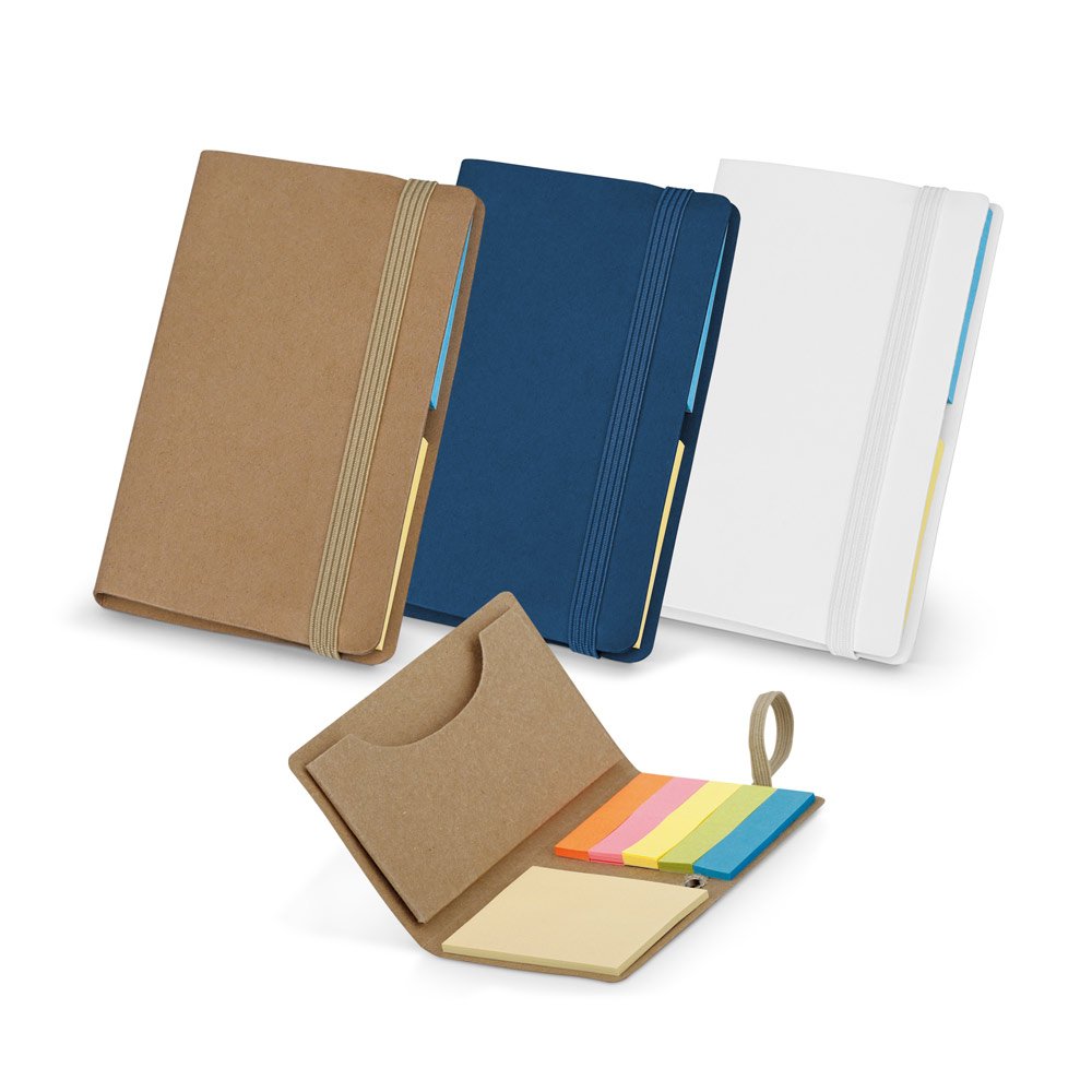Porta cartões em kraft com elástico, acompanha 6 blocos adesivados com 22 folhas cada.