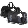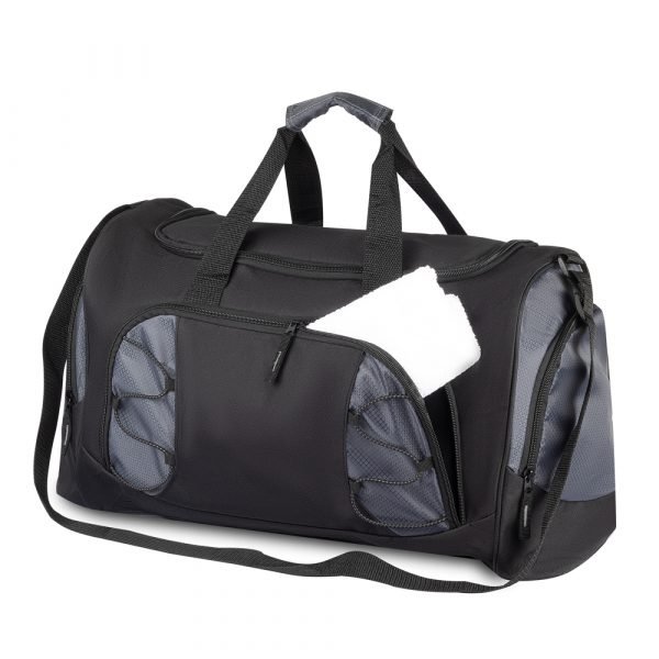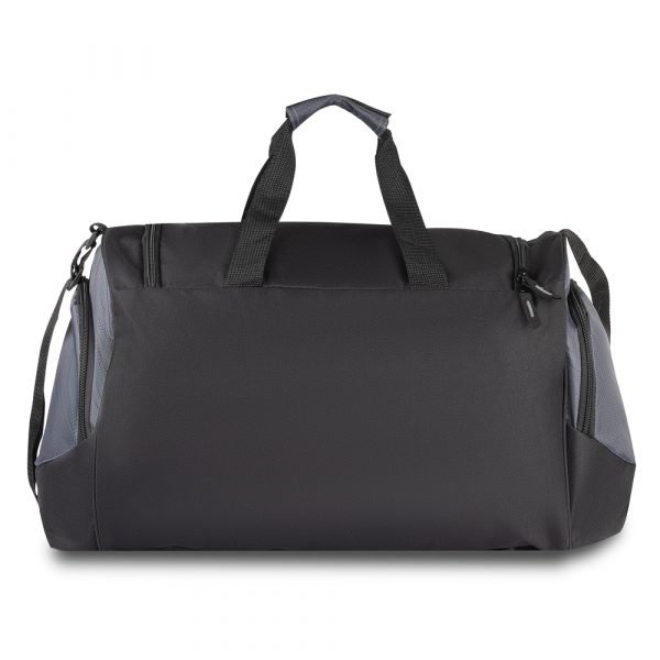 Bolsa esportiva em poliéster, compartimento interno para roupas e compartimento externo para roupa suja. Na parte inferior da mala possui 4 borrachas de apoio para que a mala não encoste diretamente no chão. Zíper frontal e bolsos laterais, com alça de mão e ombro.