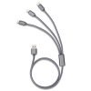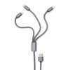 Cabo de dados 3 em 1 com revestimento em nylon, contém as saídas USB: Tipo-C, Lightning e V8.