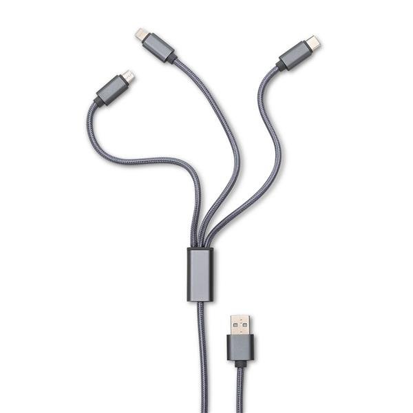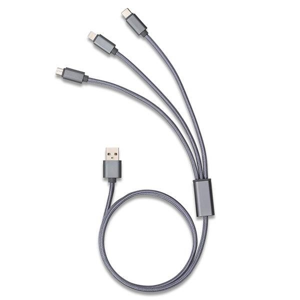 Cabo de dados 3 em 1 com revestimento em nylon, contém as saídas USB: Tipo-C, Lightning e V8. Tamanho: 1 metro.