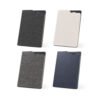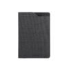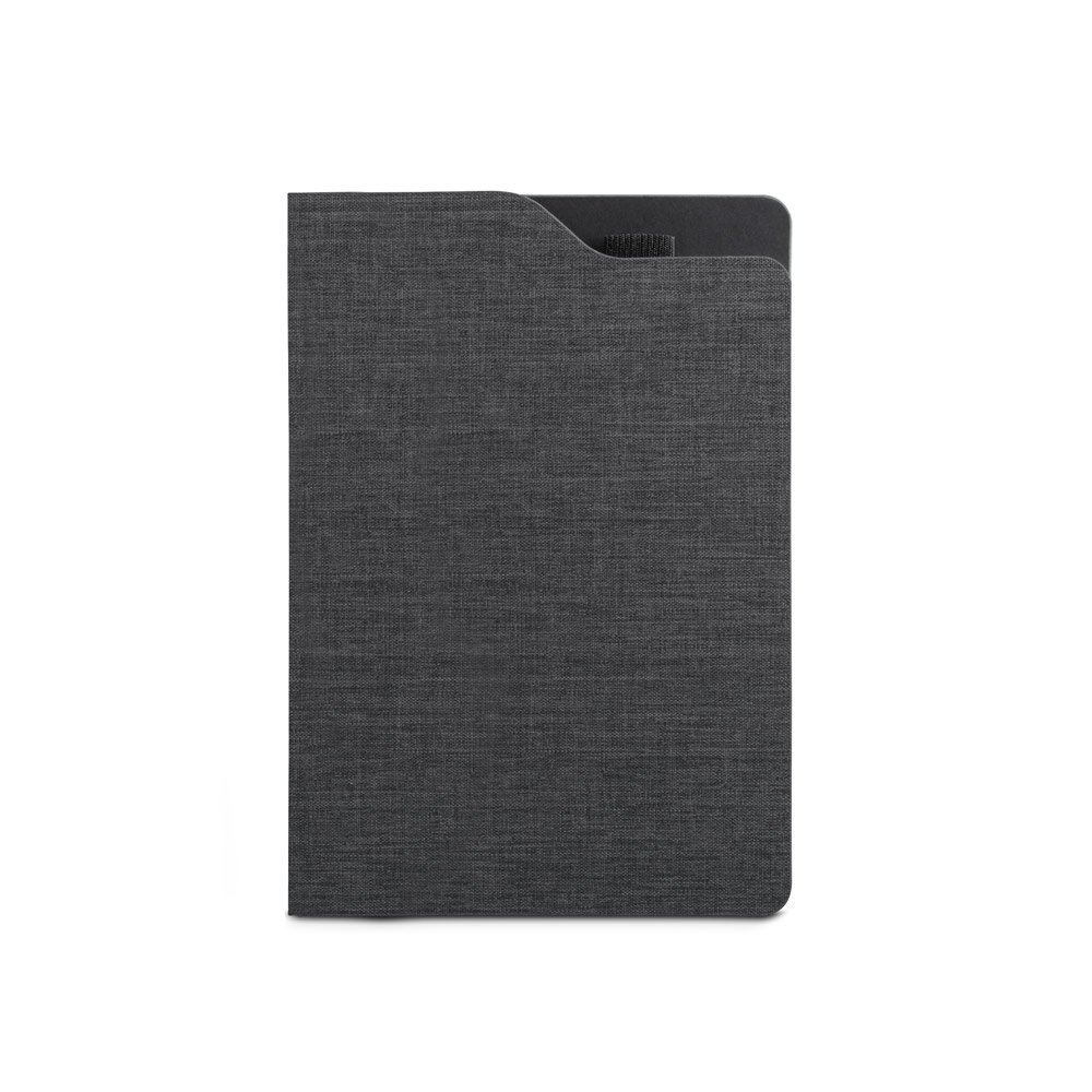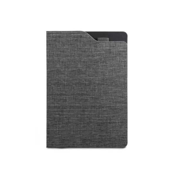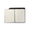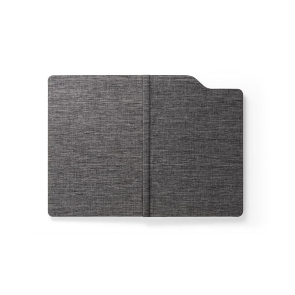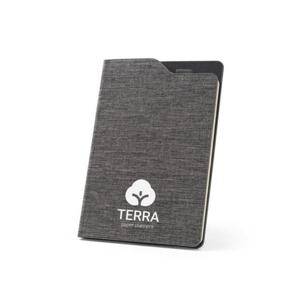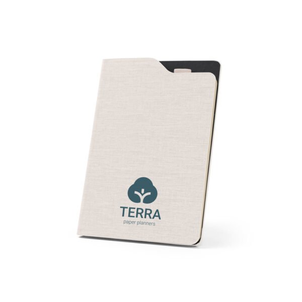 Caderno A5 em poliéster reciclado. O interior contém 80 folhas pautadas em papel cor marfim reciclado, fita separadora e suporte para caneta no topo do caderno (não inclusa).
