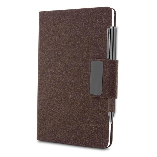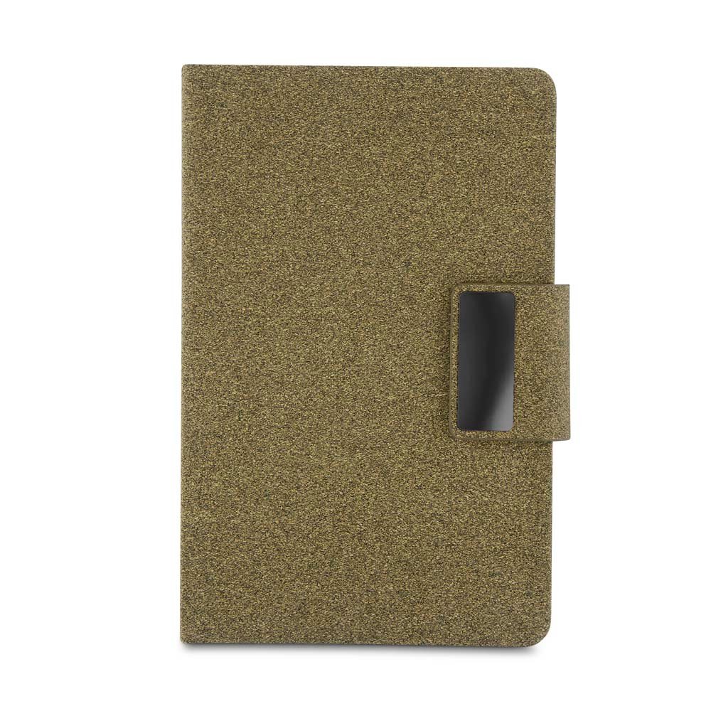 Caderno de anotações com capa em PU e fibra de chá ou café, 80 folhas em papel 70 g/m², fechamento magnético com engate para caneta e placa de metal decorativa. Não acompanha caneta.