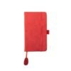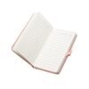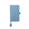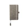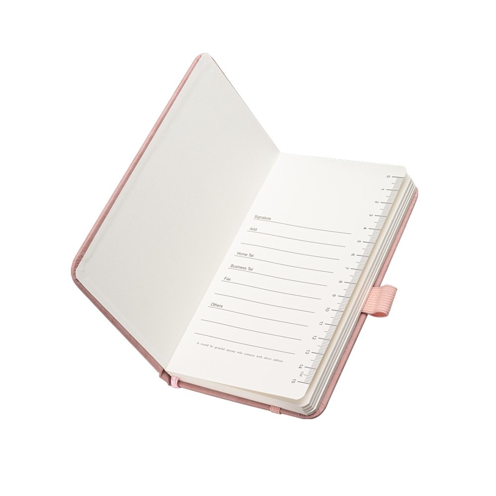 Caderno com capa emborrachada, com 96 folhas pautadas, régua integrada, suporte para caneta, elástico de fechamento e espaço para personalização.
