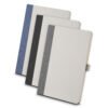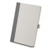 Caderno para anotações. Contém capa feita em fibra de açucar e tecido RPET com suporte para caneta, miolo com 80 folhas pautadas na cor bege.