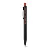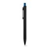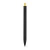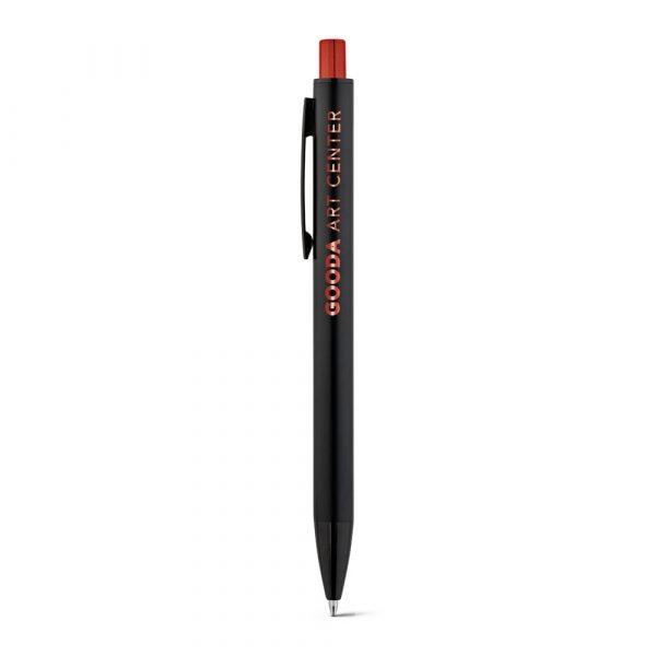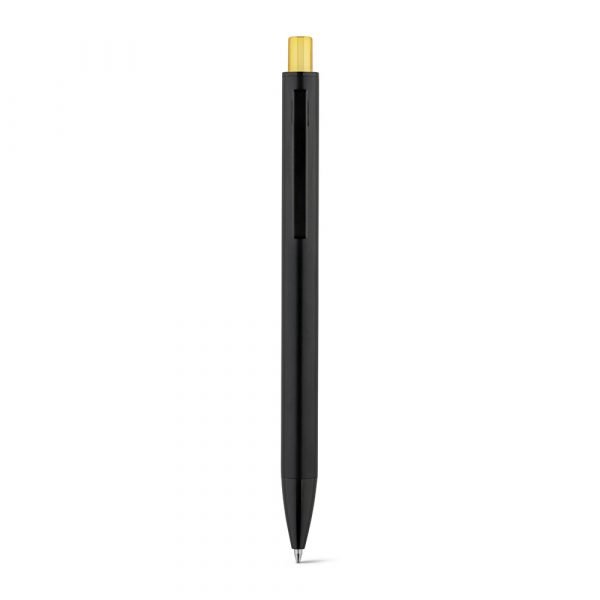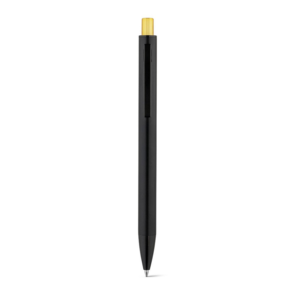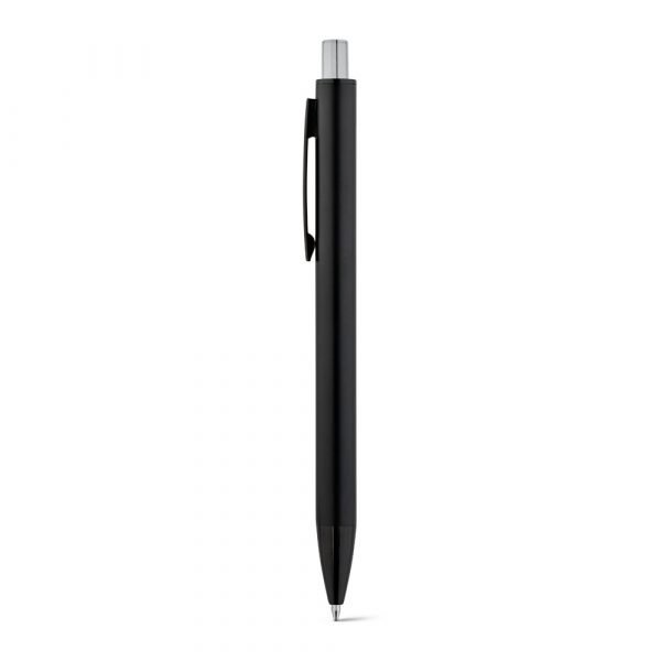 Caneta em alumínio com acabamento mate e botão com acabamento brilhante. Corpo com duplo acabamento.