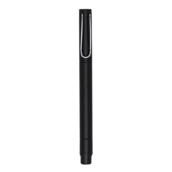 Caneta plástica esferográfica e marca texto, inteira colorida com detalhes preto. Clip de metal, possui tampa de ambos lados. Obs.: Indiferente de cor, todos marca textos são amarelos.