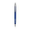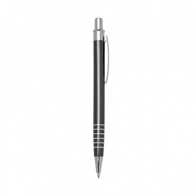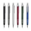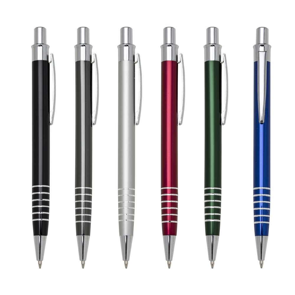 Caneta metal inteira colorida com detalhes prata. Clip metal e possui seis aneis prateados na parte inferior. Aciona por clique.