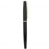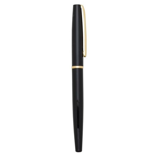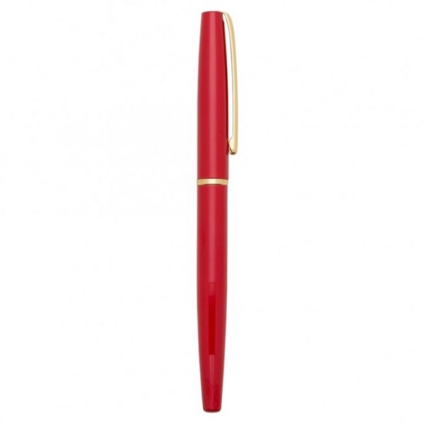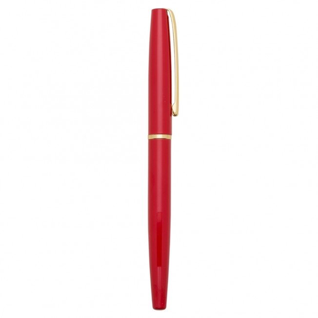 Caneta roller de metal com clip e anel central dourado. Basta tirar a tampa para uso.
