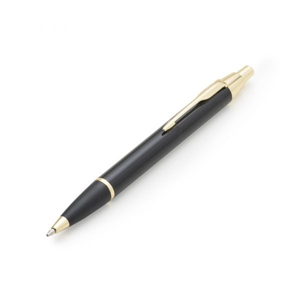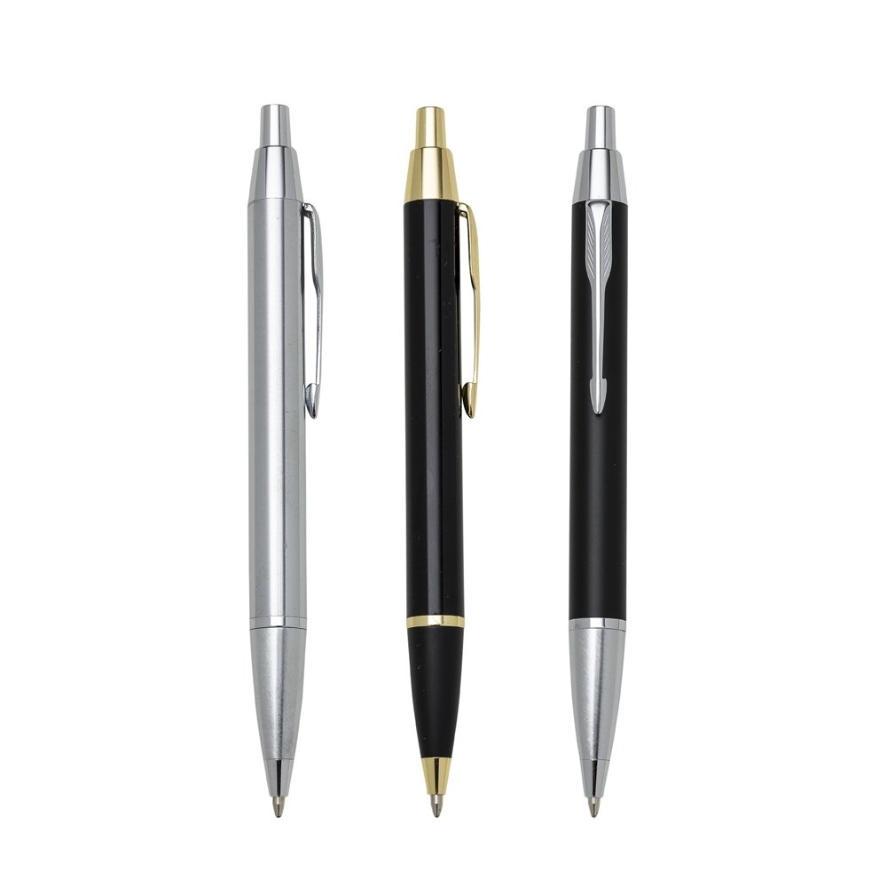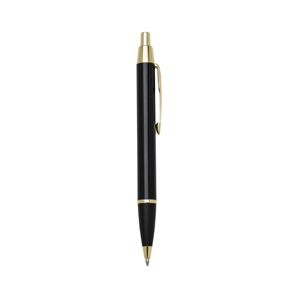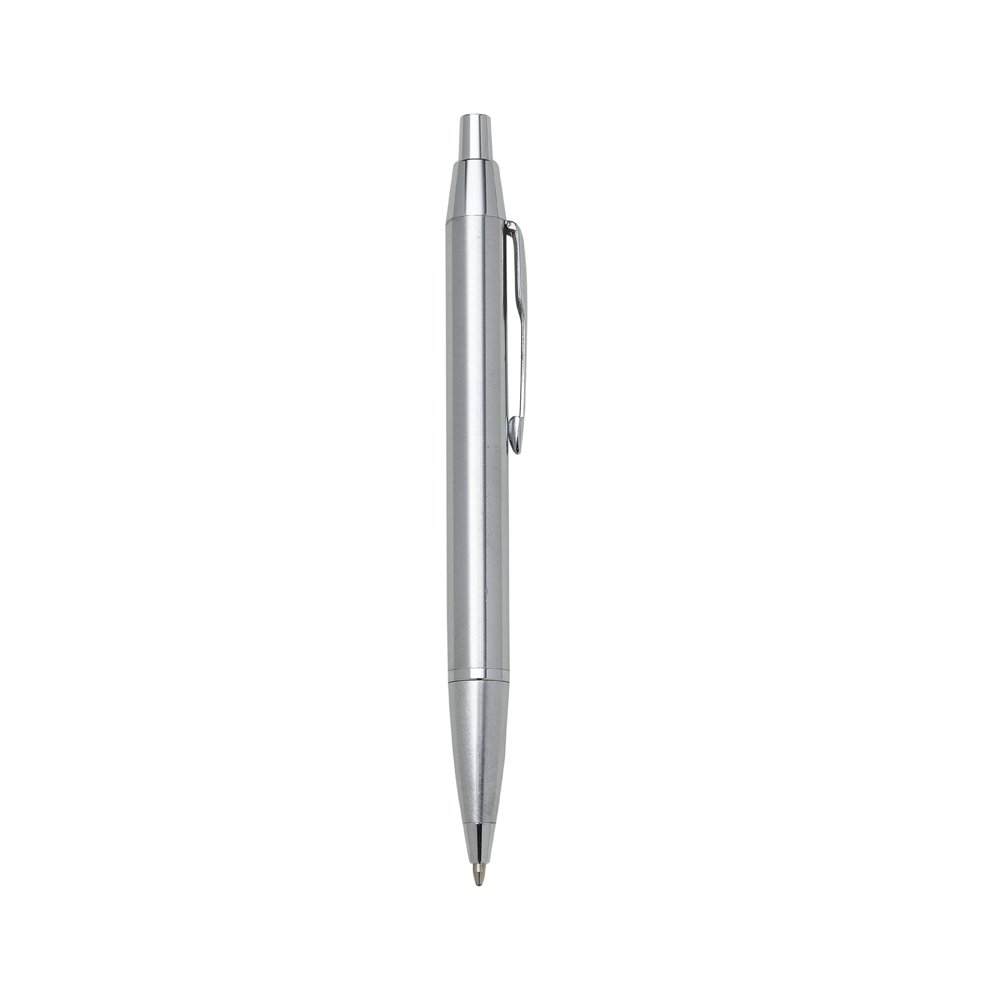Caneta metálica com carga esferográfica azul e acionamento por clique, proporcionando uma escrita suave e conveniente para suas tarefas diárias.