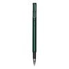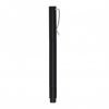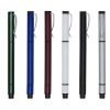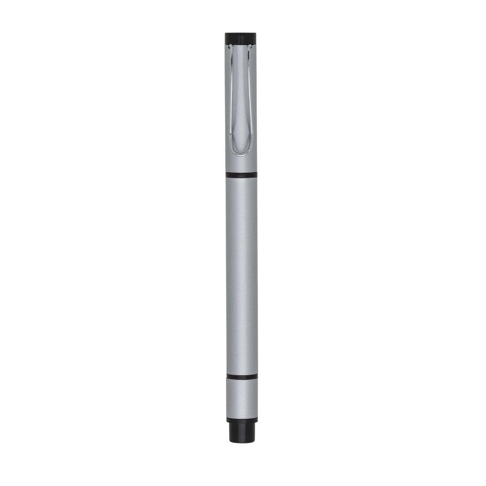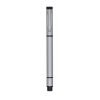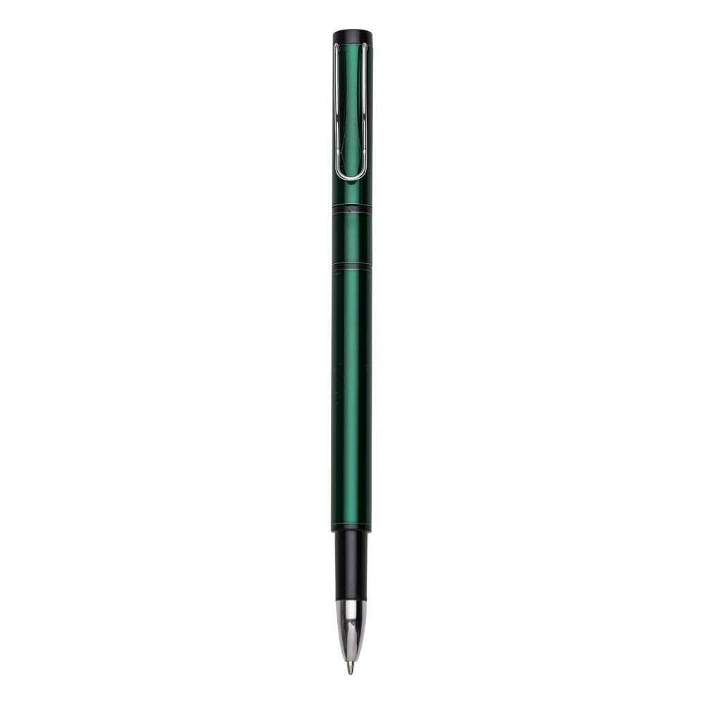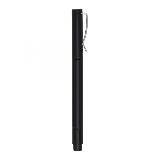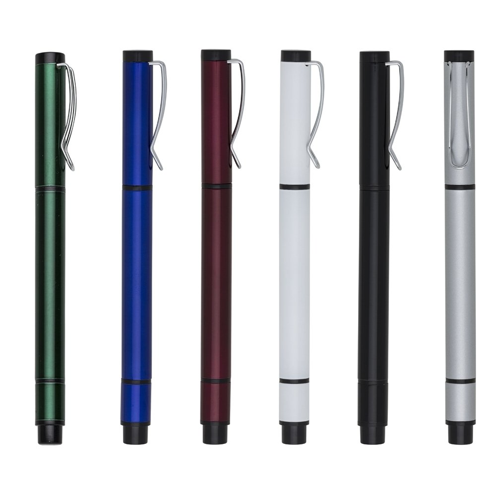Caneta metálica com marca texto. De um lado esferográfica com tinta para escrita em azul, do outro lado marca texto colorido, ambos com tampas protetoras.