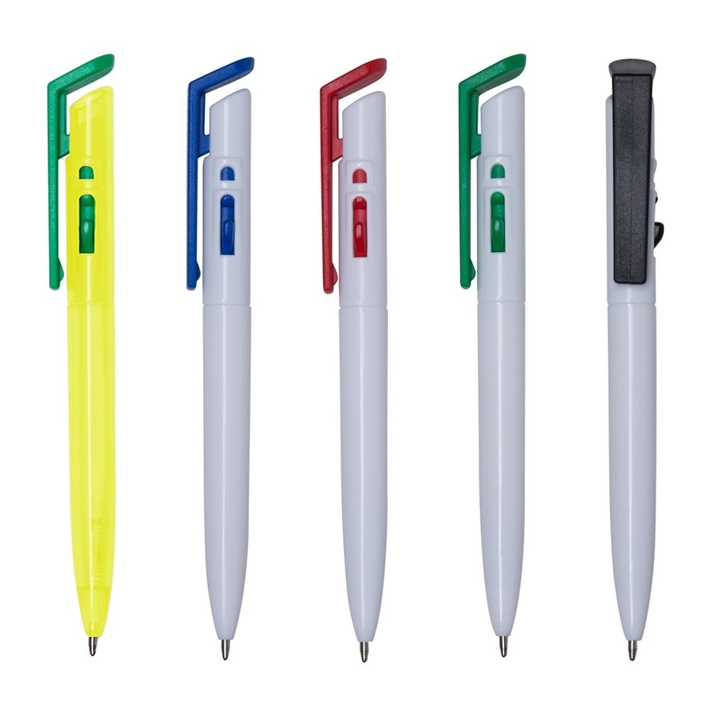 Caneta plástica com carga esferográfica azul e acionamento por clique.