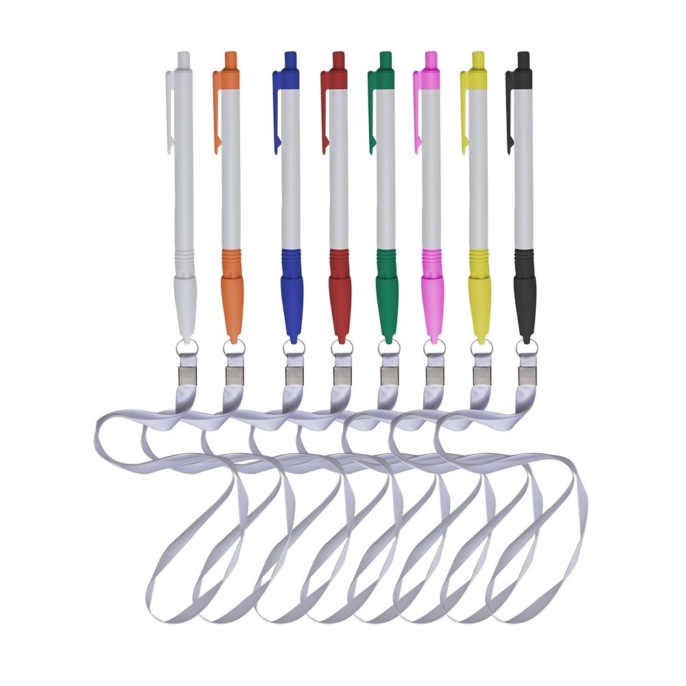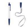 Caneta plástica com carga esferográfica azul e acionamento por clique. Acompanha cordão de poliéster com tampa para encaixe da caneta.