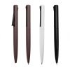 Caneta retrátil, combina estilo e praticidade. Possui o corpo metálico e parte superior em plástico, conta com escrita em azul.