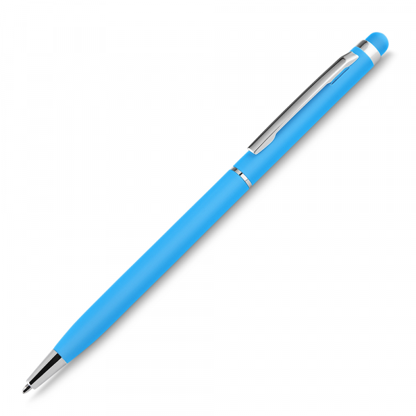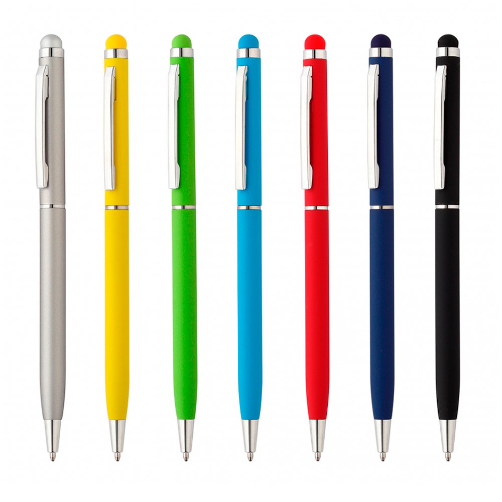 Esferográfica de metal escrita em azul, emborrachada, touch