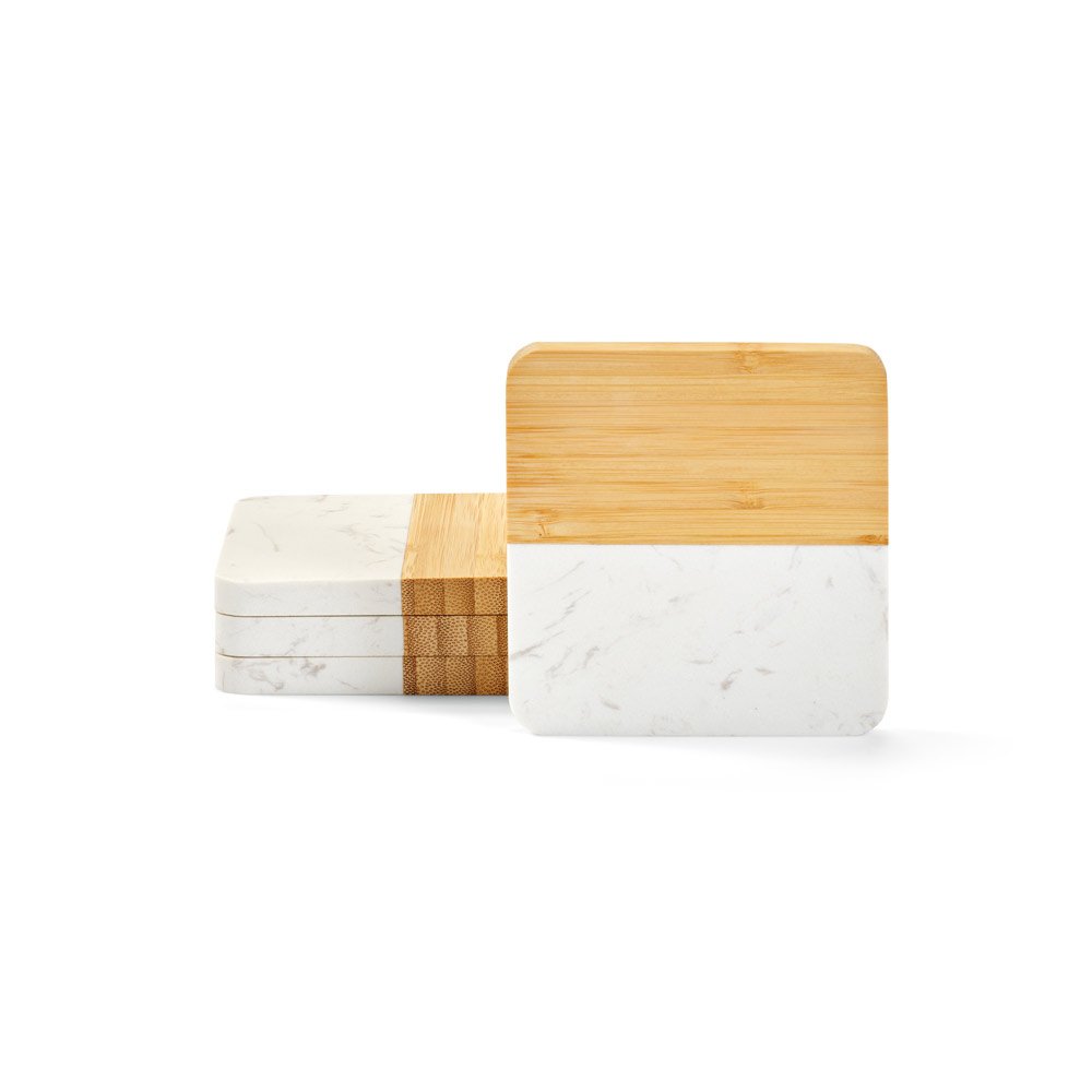 Conjunto de 4 porta copos, em mármore e bambu, com formato quadrado. Cada peça individual está dividida, pela sua metade, em mármore e bambu. Fornecido em caixa presente em papel kraft reciclado. Certificação EU Food Grade.