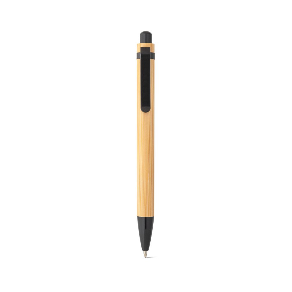 Conjunto de caderno A5 e caneta em bambu. Caderno com capa de bambu, lombada em rPET, 96 folhas recicladas e elástico para fecho. Caneta com escrita preta. Fornecido em caixa presente de oferta de papel kraft reciclado.