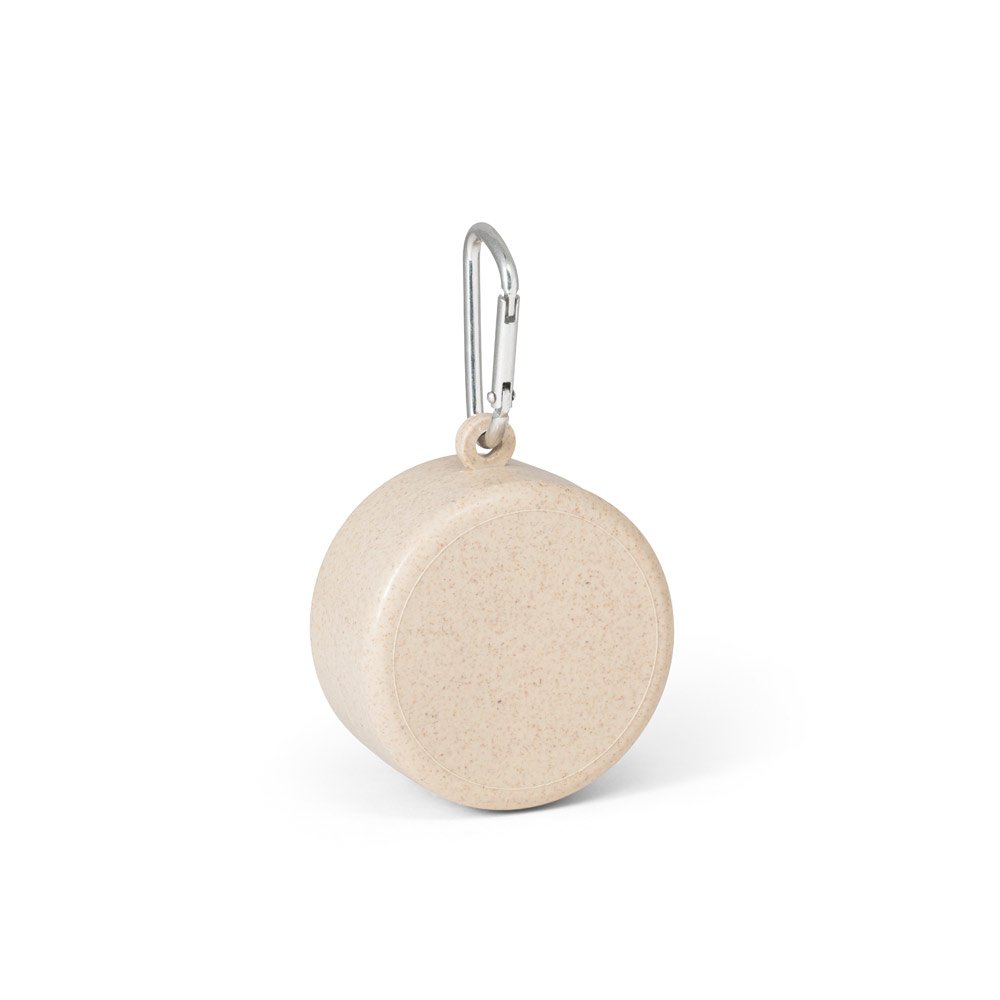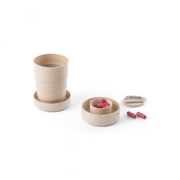Copo de viagem retrátil em fibra de bambu (50%) e PP (50%) com capacidade até 210 ml. Incluso caixa para comprimidos e mosquetão. ø65 x 33 mm.