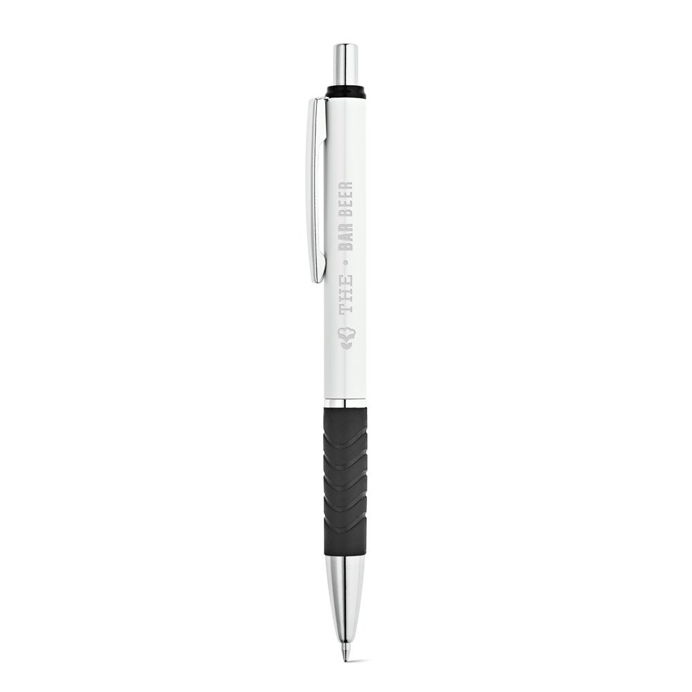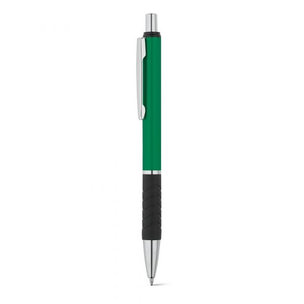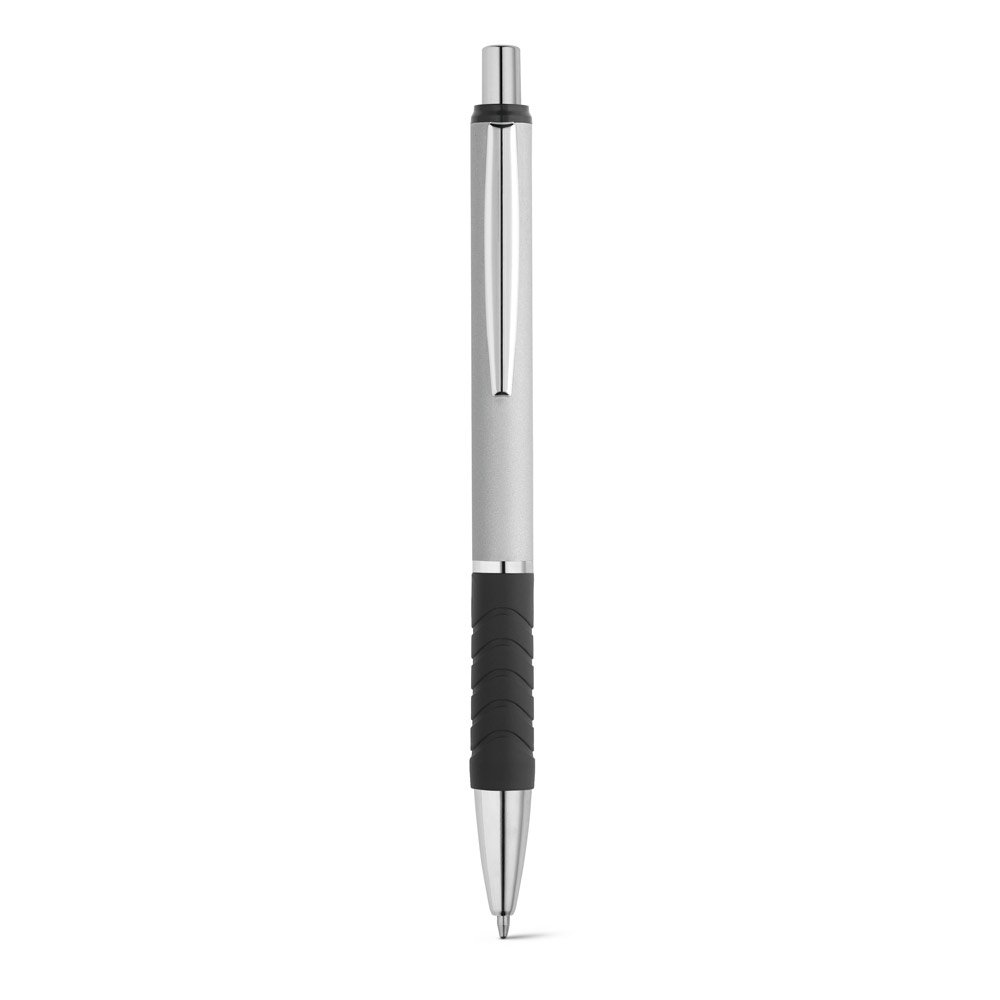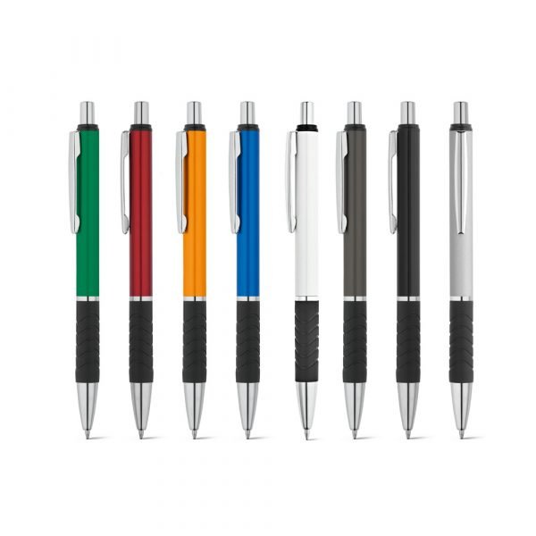 Esferográfica em alumínio com clipe de metal e grip. Até 1,5 km de escrita. ø10 x 136 mm.
