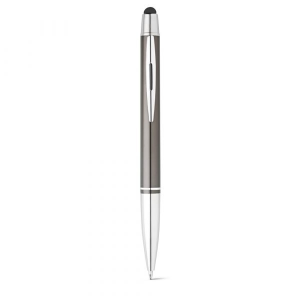 Esferográfica em alumínio com mecanismo twist, ponteira touch e clipe. Até 1,5 km de escrita