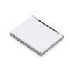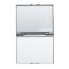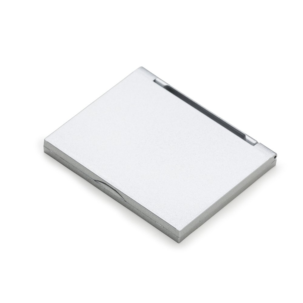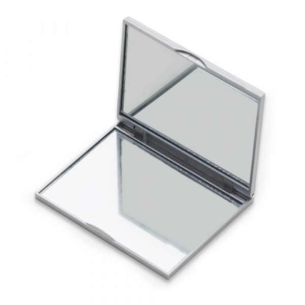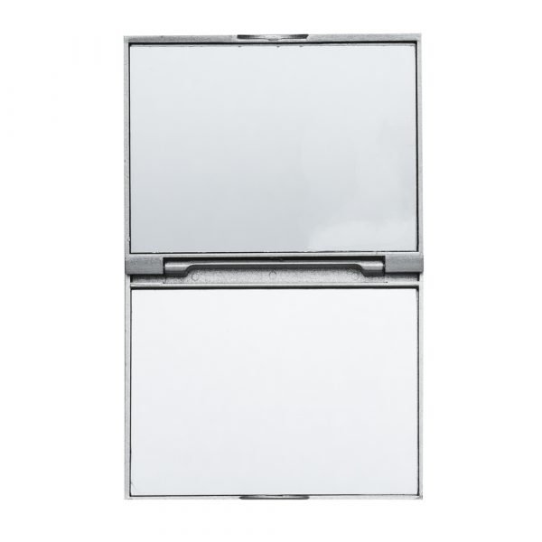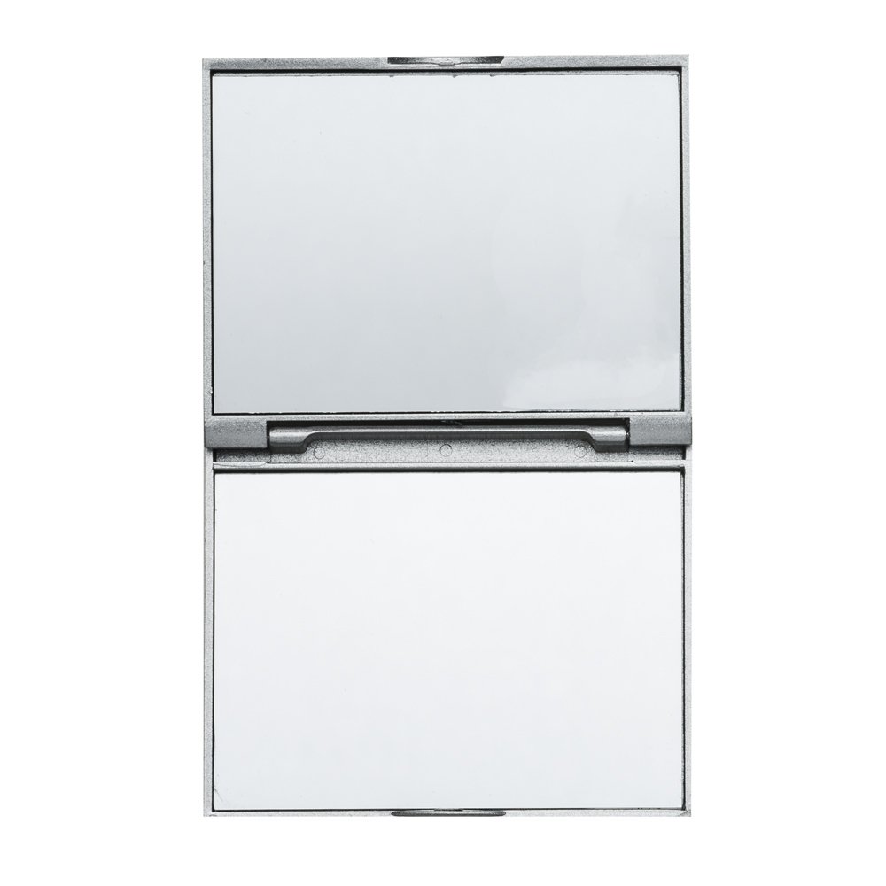 Espelho retangular duplo sem aumento, material em plástico resistente com uma faixa na superfície e verso liso. Tamanho: 6,7 x 8,3 cm.