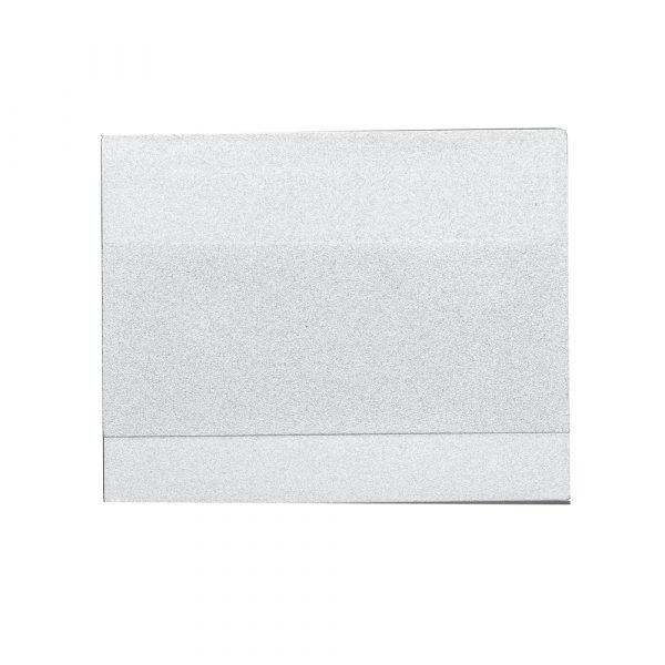 Espelho retangular duplo sem aumento, material em plástico resistente com uma faixa na superfície e verso liso.