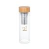 Garrafa em vidro de borossilicato com parede dupla e tampa em bambu. Incluso 2 infusores em aço inox. Capacidade até 490 ml. Apta para ir a máquina de lavar, removendo a tampa. Preserva as bebidas quentes por 2 horas e as bebidas frias por 4 horas. ø72 x 234 mm.