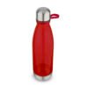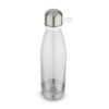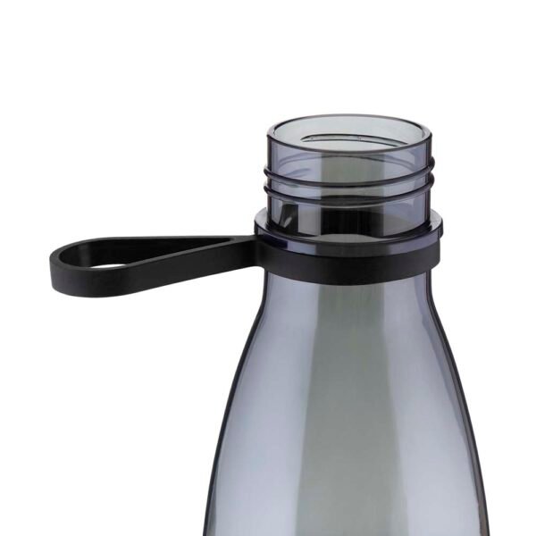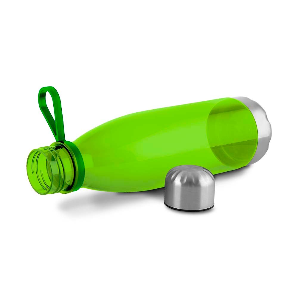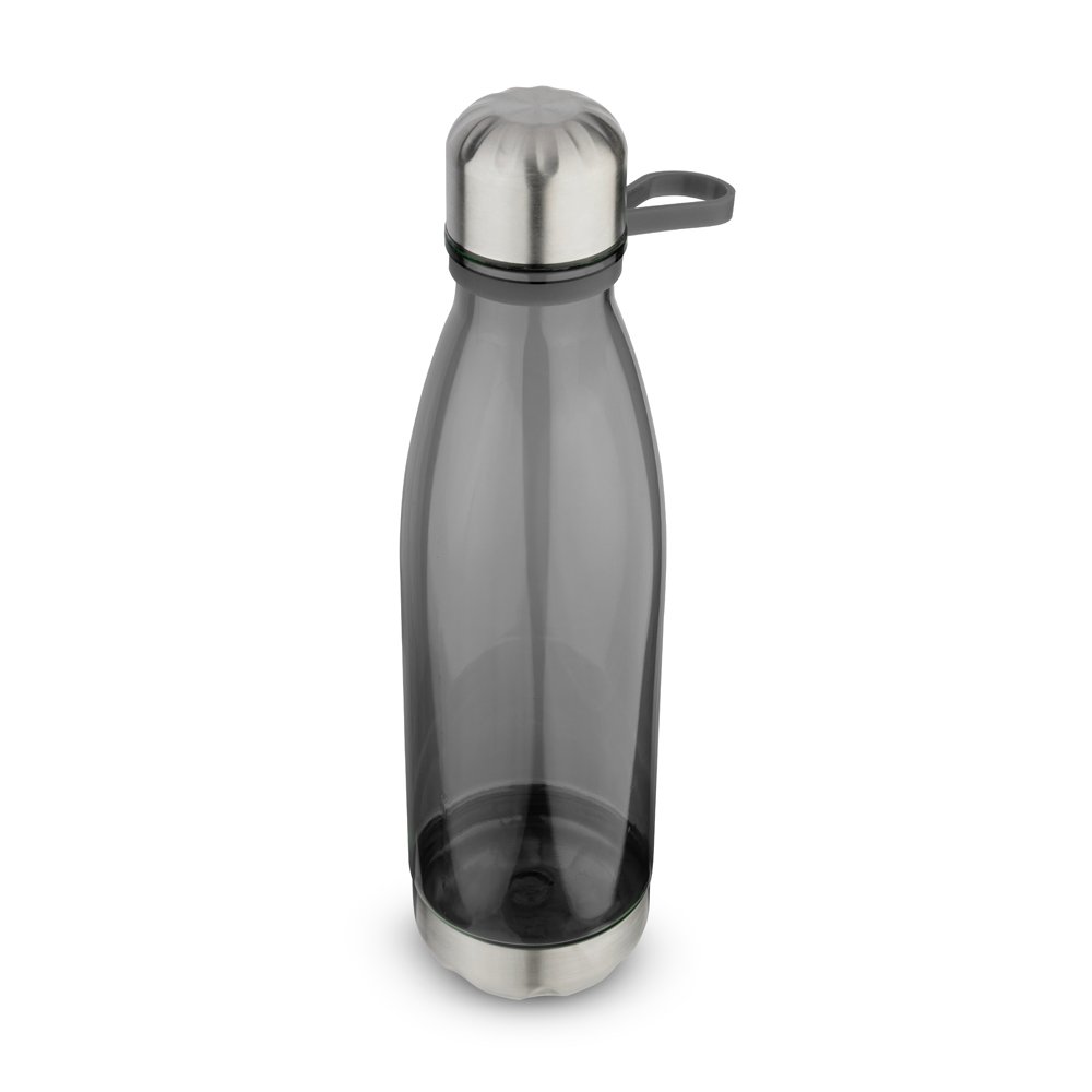 Garrafa plástica em RPET com capacidade de até 700 ml, alça flexível em silicone, tampa rosqueável com anel de vedação e base em metal, unindo sustentabilidade, praticidade e design moderno.
