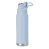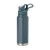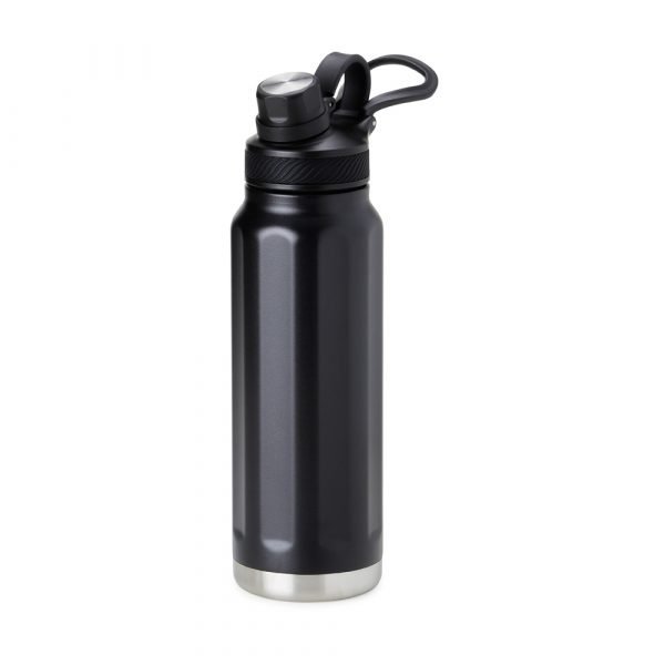 Garrafa térmica de 950ml, em inox 304 de parede dupla. Com design de faixas em relevo, tampa com alça para transporte e tampa de proteção para o bocal.