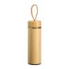 Garrafa térmica de bambu e inox 400ml, conta com infusor de metal. Contém tampa rosqueável de bambu e alça de tecido embutida.
