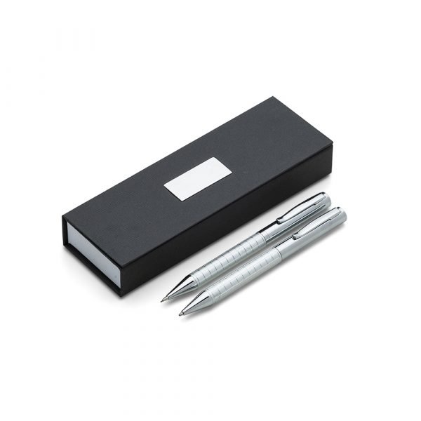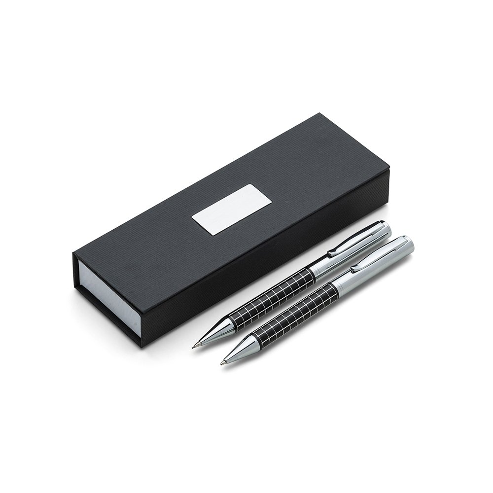 Kit caneta e lapiseira de metal em estojo papelão (revestido com espuma) com placa de metal. Caneta e lapiseira prata com detalhes coloridos e quadriculados, clip metal com anel superior na ponta e dois anéis centrais, acionam por giro.