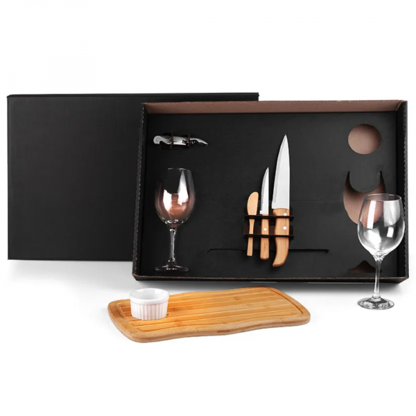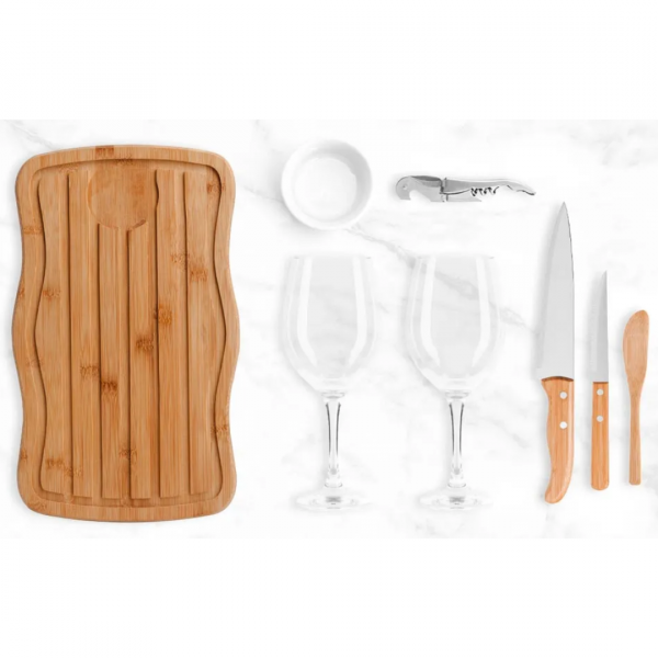Kit cozinha, petisco e vinho. Conta com tábua e espátula em Bambu; faca 7″ e faca de mesa em Metal/Bambu; ramekin em porcelana; duas taças para vinho em vidro; abridor em Metal. Produto 2 em 1, de um lado da tábua é especifica para cortar pães, do outro é ideal para Queijos e Petiscos.