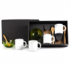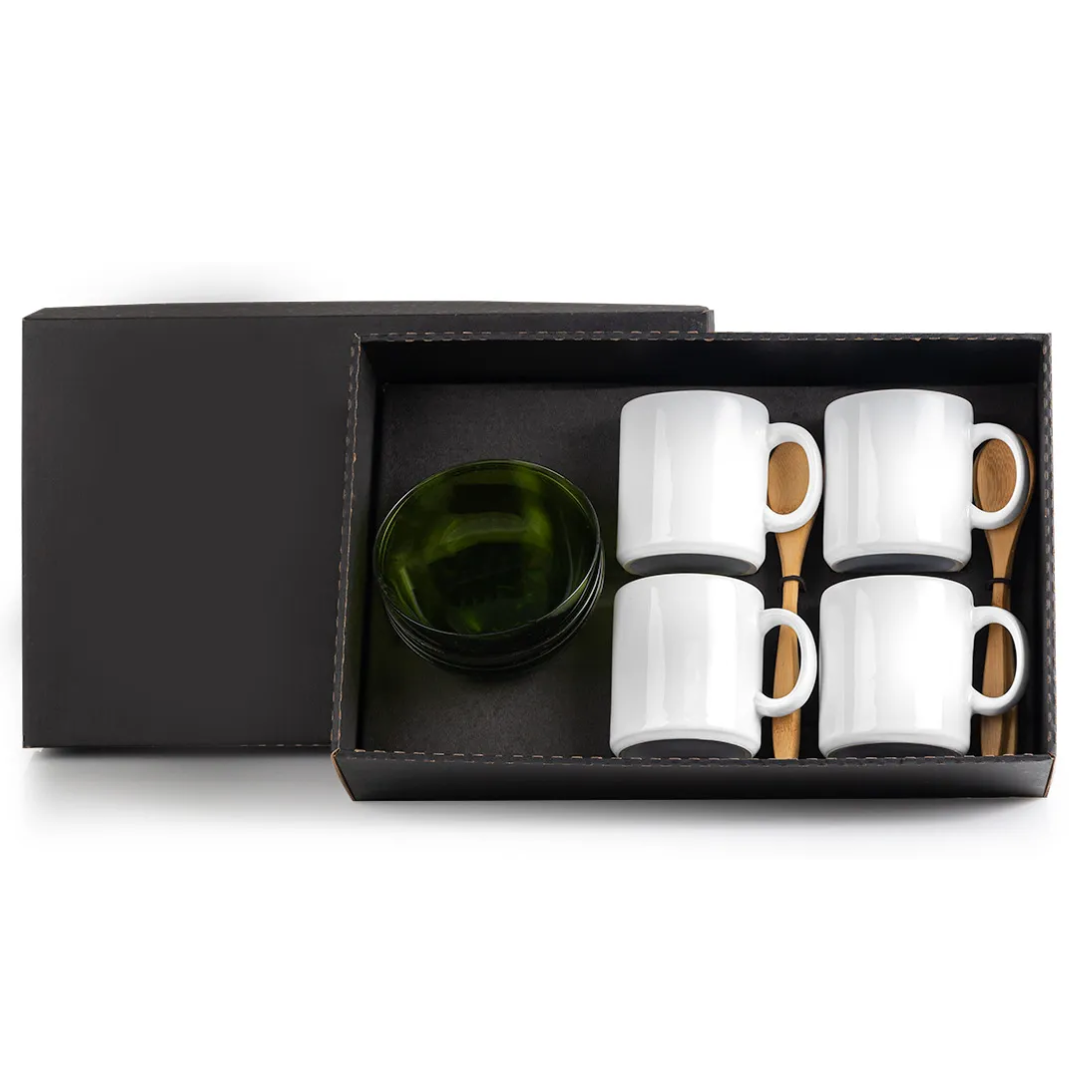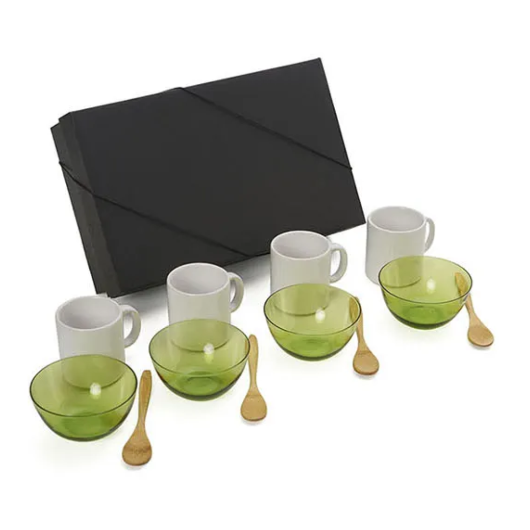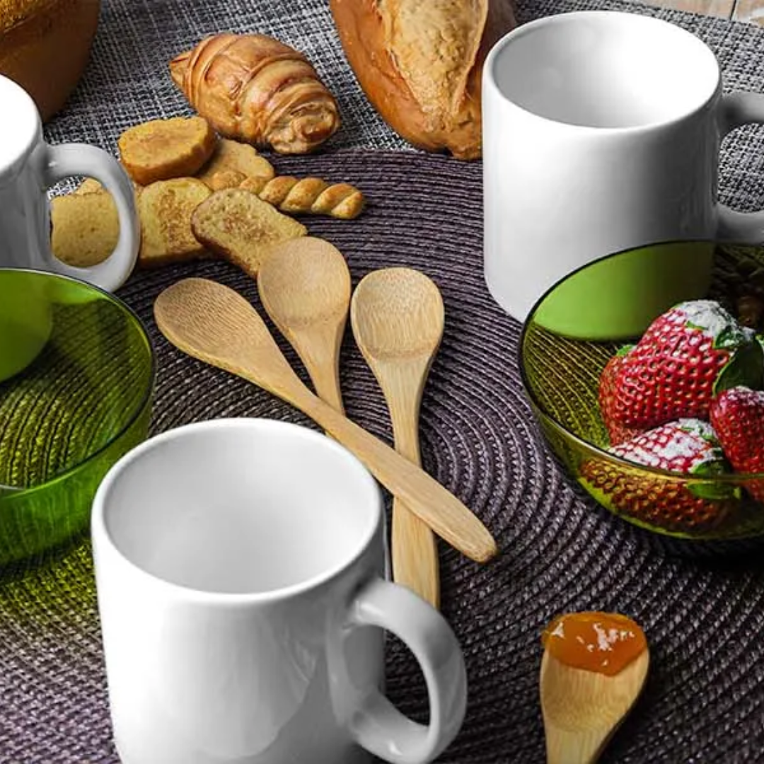 Kit Para Café Da Manhã 12 peças. Conta com quatro canecas de 270ml em cerâmica; quatro tigelas em vidro; quatro colheres em Bambu.