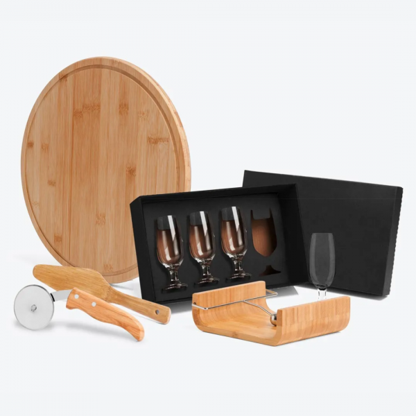 Kit Pizza em Bambu. Composto por um porta-guardanapos em Bambu, um jogo de quatro taças de 300ml acomodados em uma caixa kraft com tampa. Possui também tábua redonda em tripla camada invertida de Bambu com Ø 35cm, uma espátula em bambu de 26cm e um cortador de pizza com cabo em Bambu.