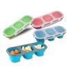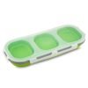 Lancheira dobrável de silicone e polipropileno com 3 divisórias. Tampa transparente fosca com lacres nas laterais, lancheira para porções colorida com borda cinza.