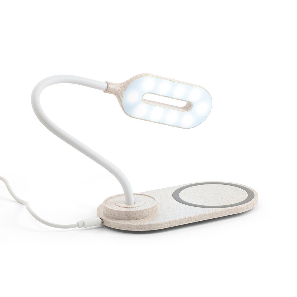 Luminária de mesa em ABS e fibra de palha de trigo com carregador wireless. Haste flexível para ajuste, 20 LEDs para iluminação até 3 níveis de intensidade. Botão touch para ligar, desligar e ajustar os níveis de iluminação. Carregamento rápido com potência até 10W, entradas 5V/2A e 9V/1.67A. Apoio de silicone. Incluso cabo micro USB de 1 m.160 x 268 x 85 mm