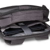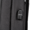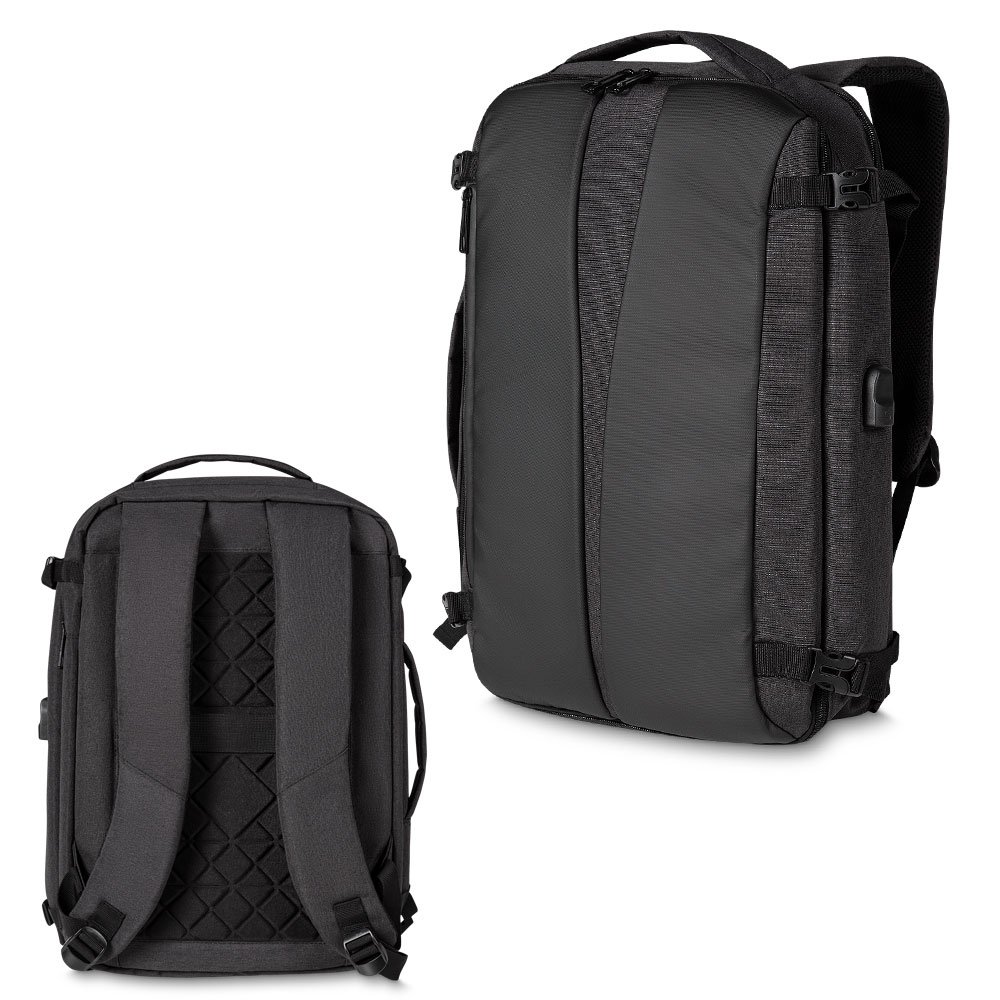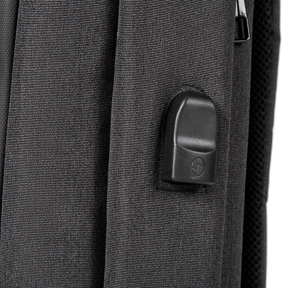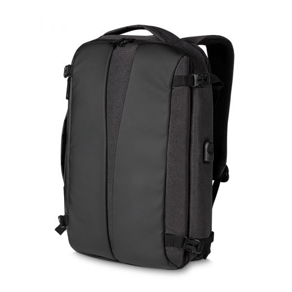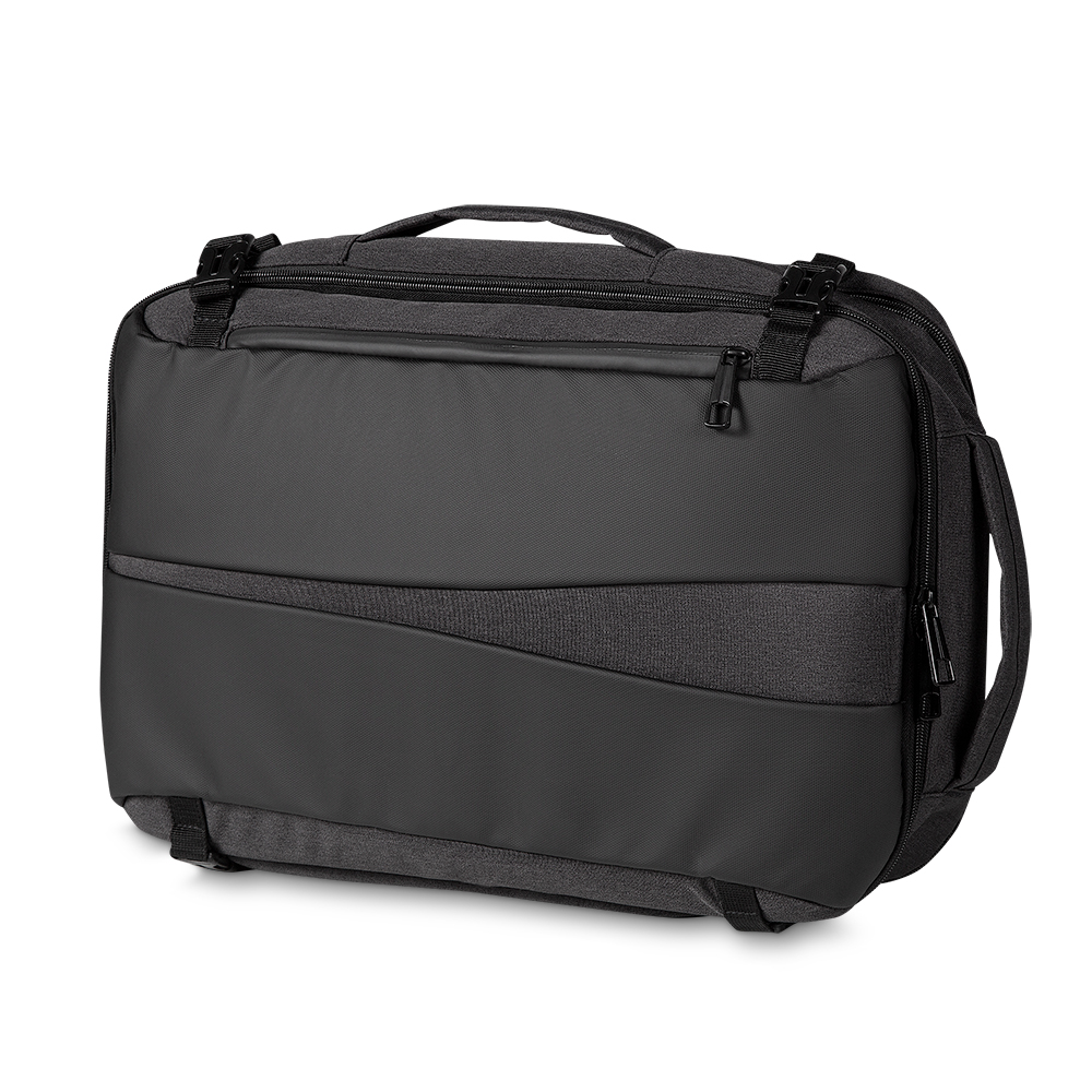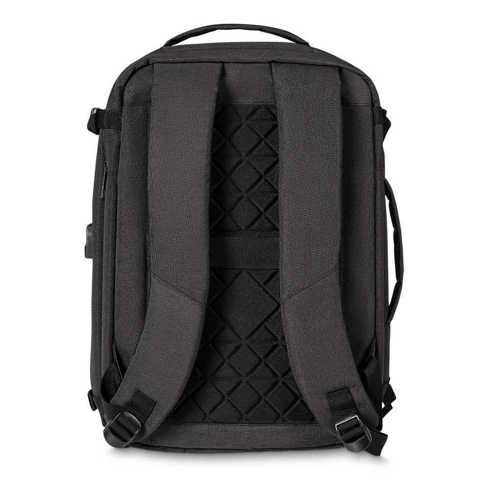 Parte externa: Conector USB na lateral; Alça de mão e ombro acolchoadas; Bolso para guardar a alça de ombro; Engate para mala de viagem.