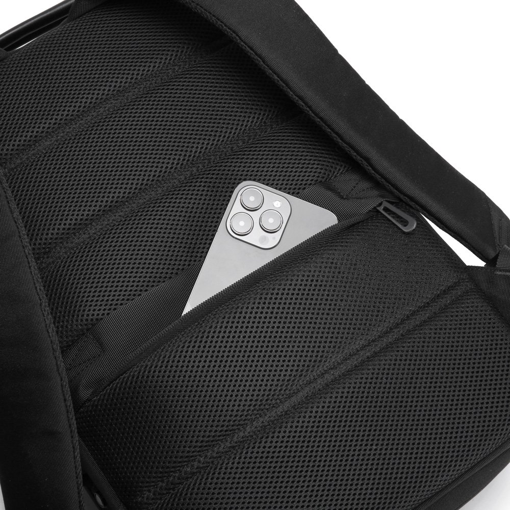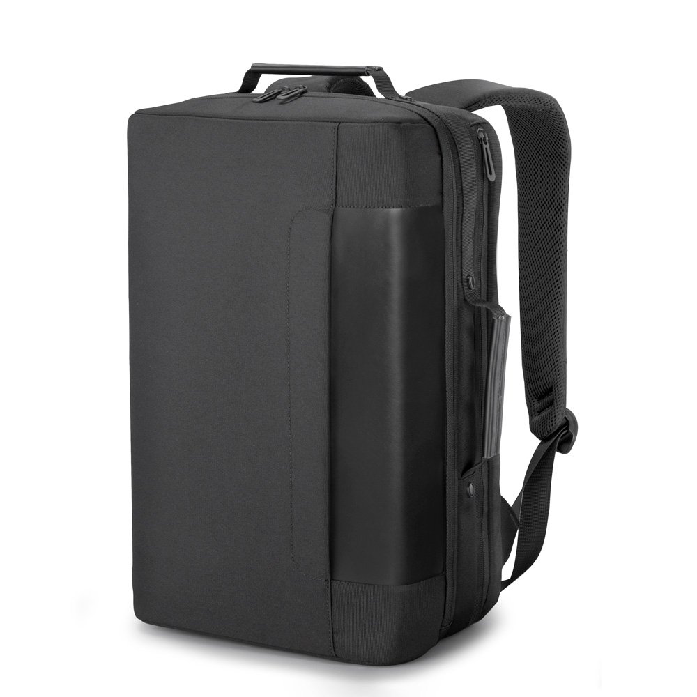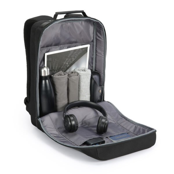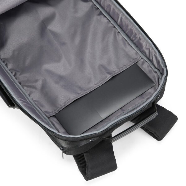 Mochila premium em poliéster acolchoado. Com alças de ombro acolchoadas, interior com divisórias, bolso frontal com zíper e divisória atrás do engate para mala de viagem.