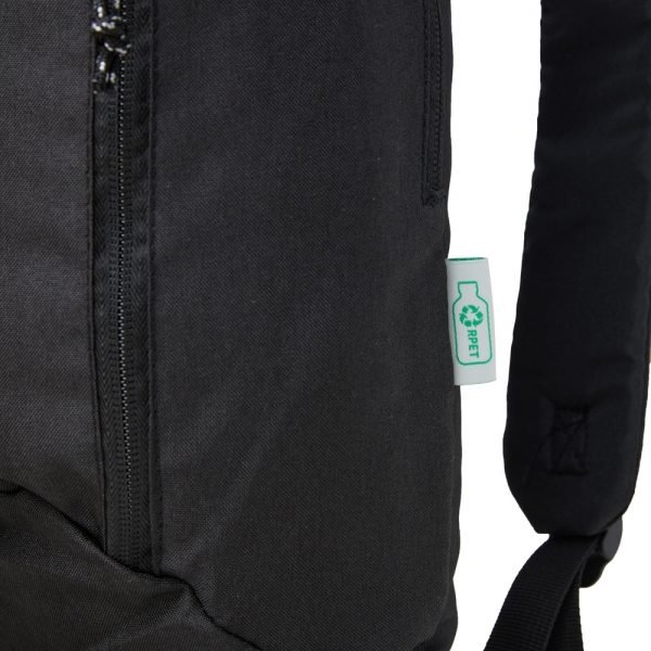 Mochila rPET de 9 litros com dois compartimentos principais, bolsos laterais, alças ajustáveis e design ecológico e durável, ideal para o dia a dia.
